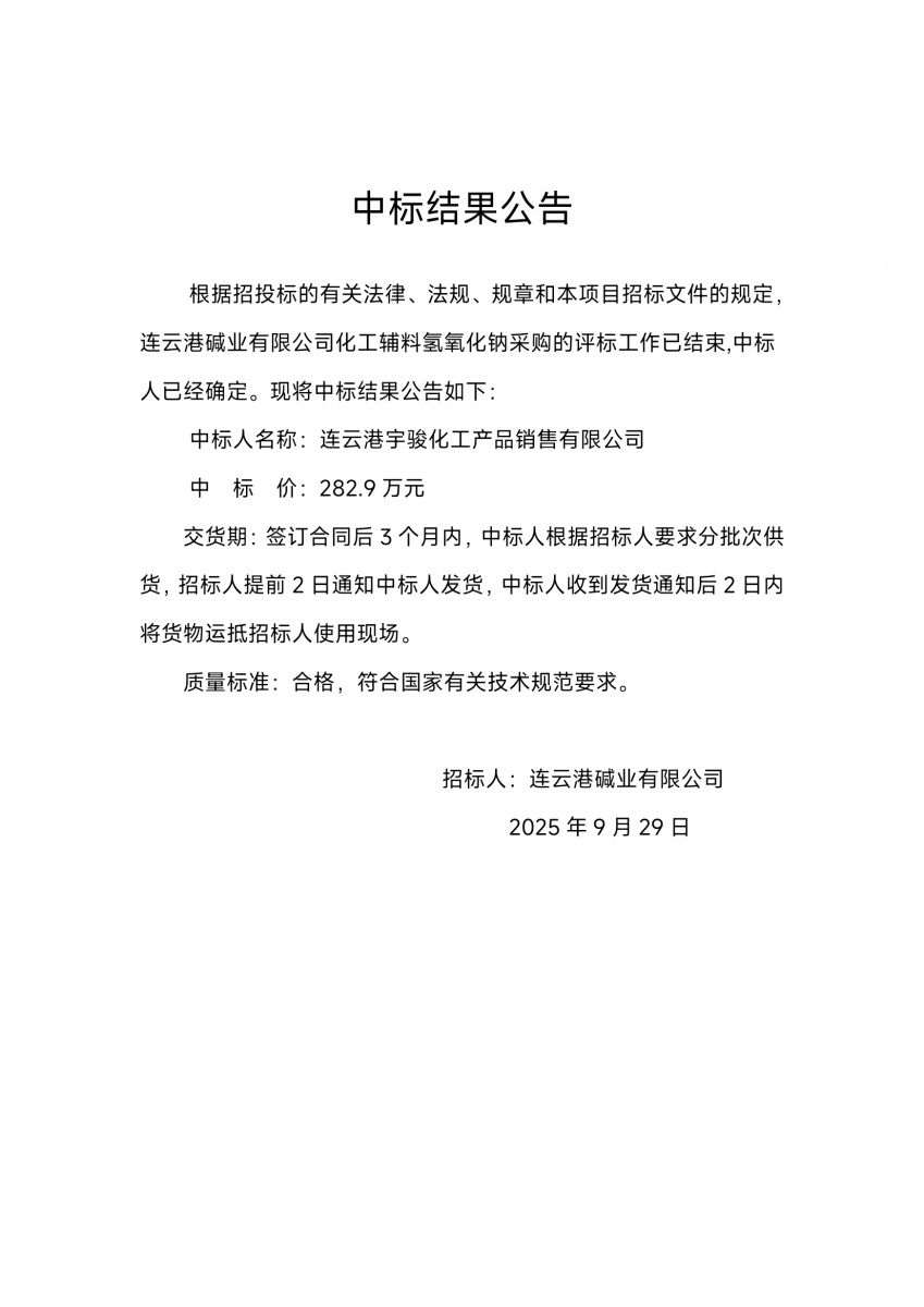 連云港堿業(yè)有限公司化工輔料氫氧化鈉采購中標結(jié)果公告