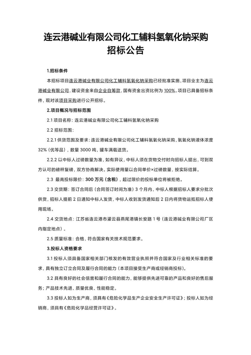 連云港堿業(yè)有限公司化工輔料氫氧化鈉采購招標(biāo)公告