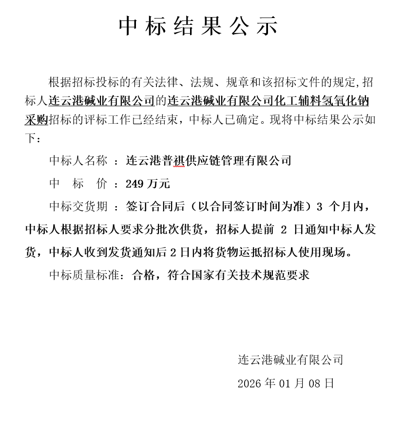 連云港堿業(yè)有限公司化工輔料氫氧化鈉采購中標(biāo)結(jié)果公示