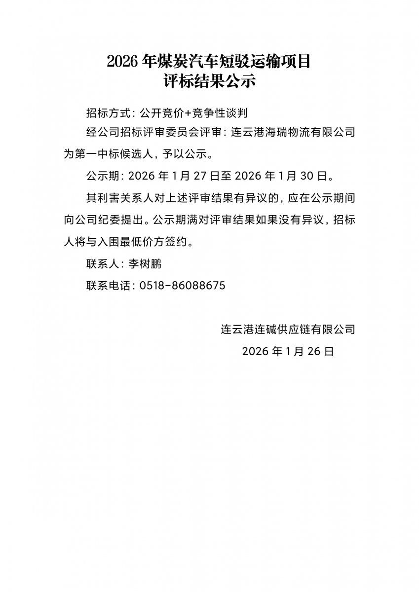 2026年煤炭汽車短駁運(yùn)輸項(xiàng)目評(píng)標(biāo)結(jié)果公示