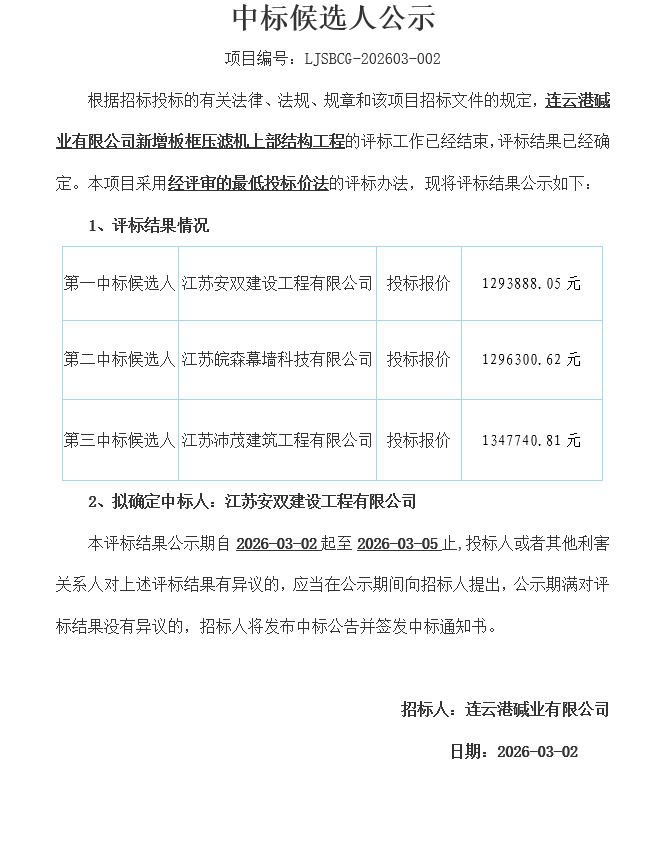 連云港堿業(yè)有限公司新增板框壓濾機上部結(jié)構(gòu)工程中標候選人公示