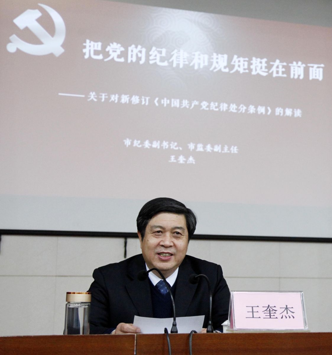 課上,王奎杰結(jié)合實際案例,以圖文并茂的形式,從修訂《條例》的重大意義、修改了哪些內(nèi)容、領(lǐng)導干部如何貫徹執(zhí)行好等三個方面,對《中國共產(chǎn)黨紀律處分條例》行了全面闡釋。并著重就如何把握《條例》的總則和違反政治紀律、組織紀律、廉潔紀律、群眾紀律、工作紀律、生活紀律的重點問題作了詳細講解。
