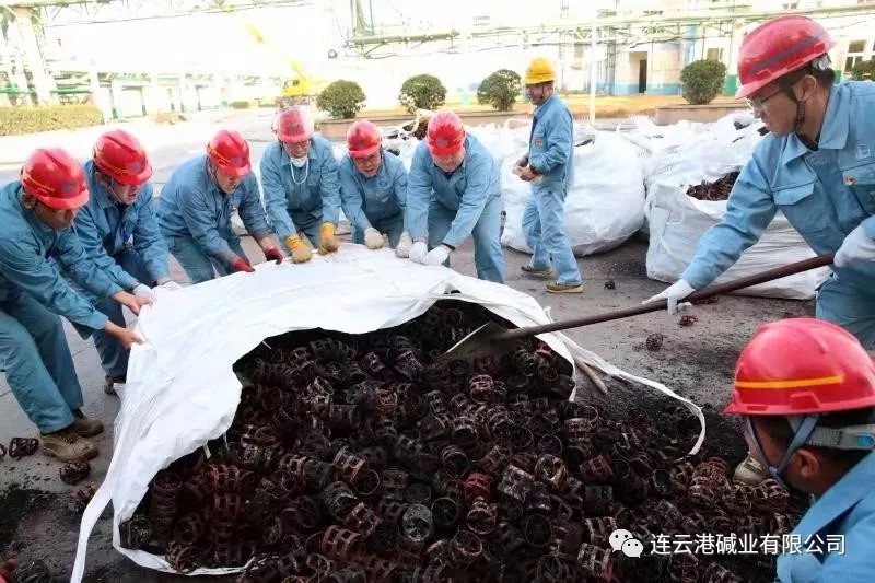 11月7日,重堿車間1#蒸餾塔計(jì)劃檢修,在檢查過程中發(fā)現(xiàn)鮑爾環(huán)被堿渣堵塞嚴(yán)重,影響正常輪換。11月12日,車間將塔內(nèi)舊填料扒出,足足有75立方。考慮到這些填料清理干凈后還有利用價值,車間牢固樹立“過緊日子”的思想,打算自行組織職工清理。