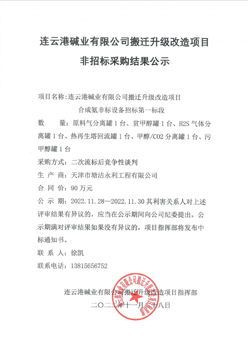 合成氨非標(biāo)設(shè)備招標(biāo)第一標(biāo)段非標(biāo)采購結(jié)果公示