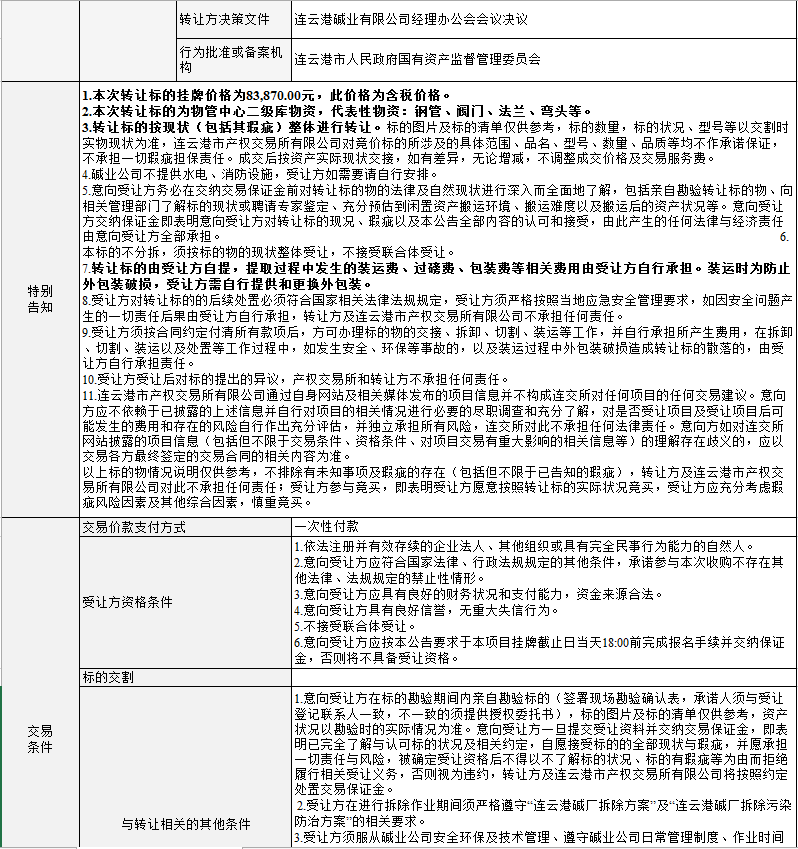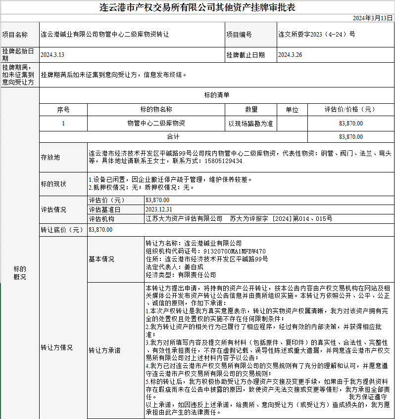 連云港堿業(yè)有限公司物管中心二級庫物資轉讓公告