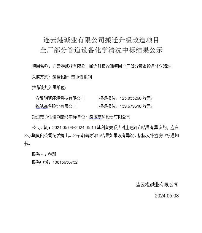 搬遷升級(jí)改造項(xiàng)目全廠部分管道設(shè)備化學(xué)清洗中標(biāo)結(jié)果公示