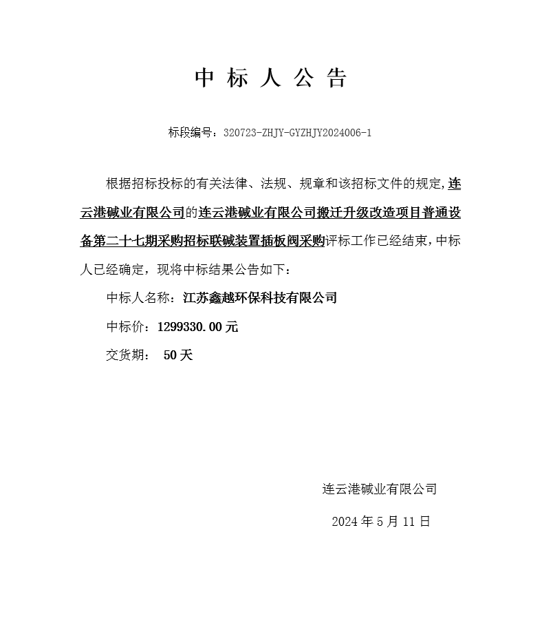 搬遷升級改造項目普通設(shè)備第二十七期采購招標聯(lián)堿裝置插板閥采購中標人公告