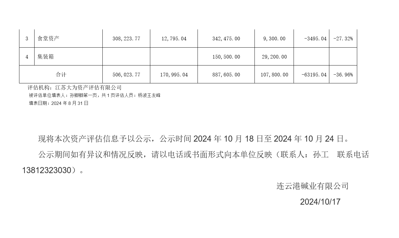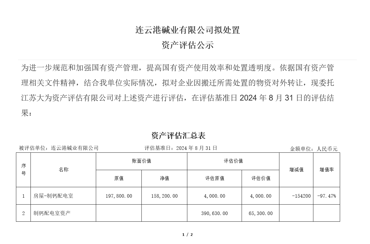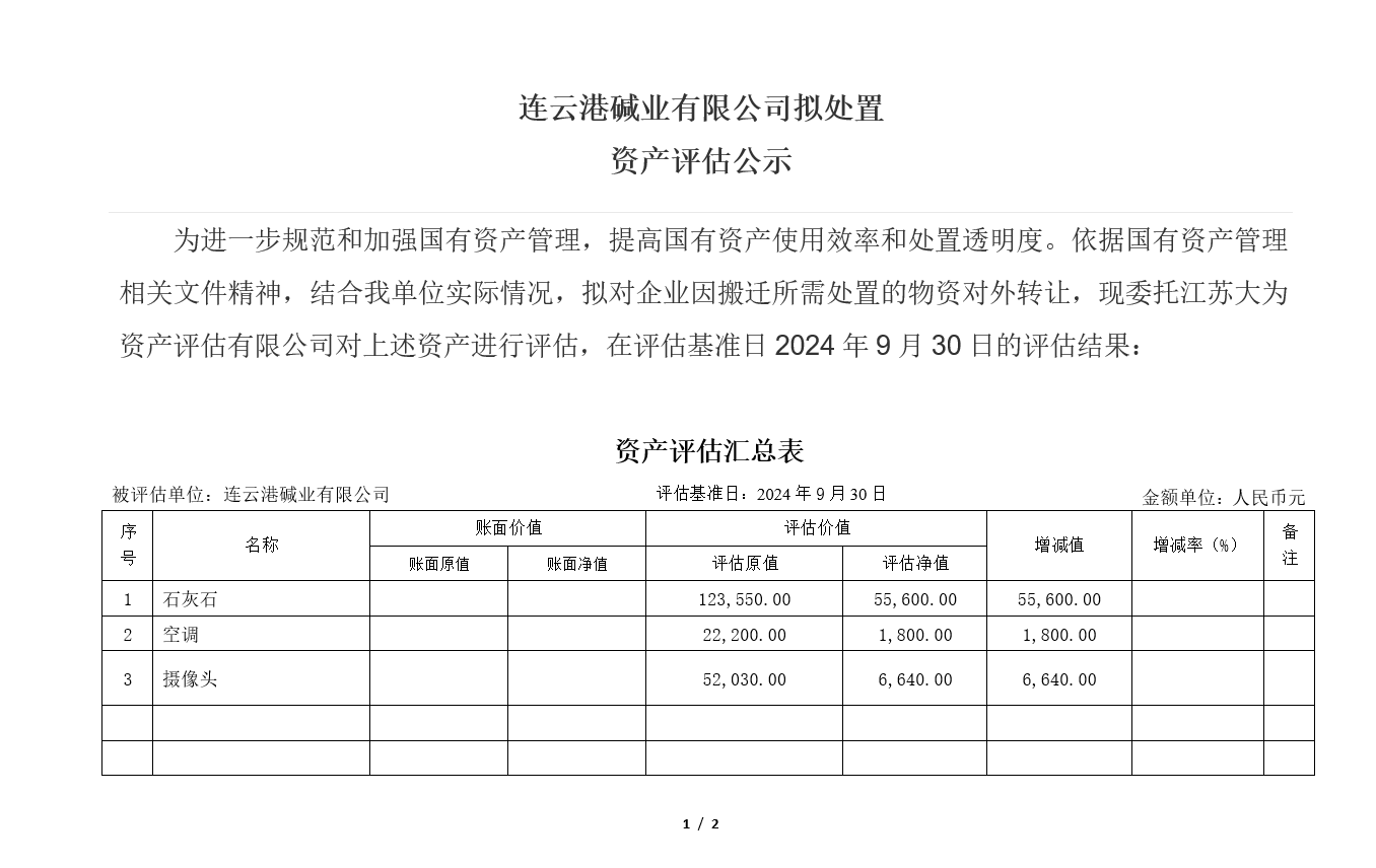 連云港堿業(yè)有限公司老廠區(qū)食堂等廢舊物資資產(chǎn)評(píng)估公示