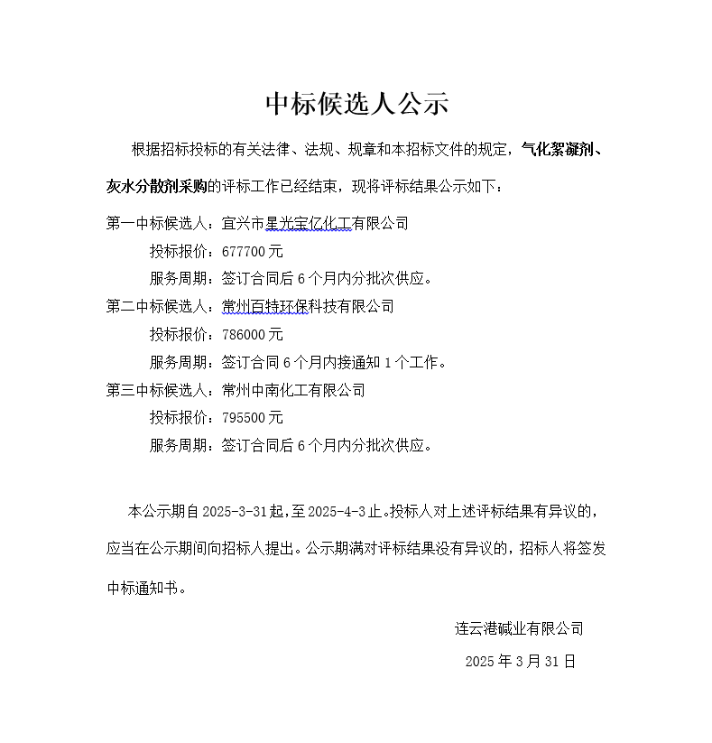 氣化絮凝劑、灰水分散劑采購(gòu)中標(biāo)候選人公示
